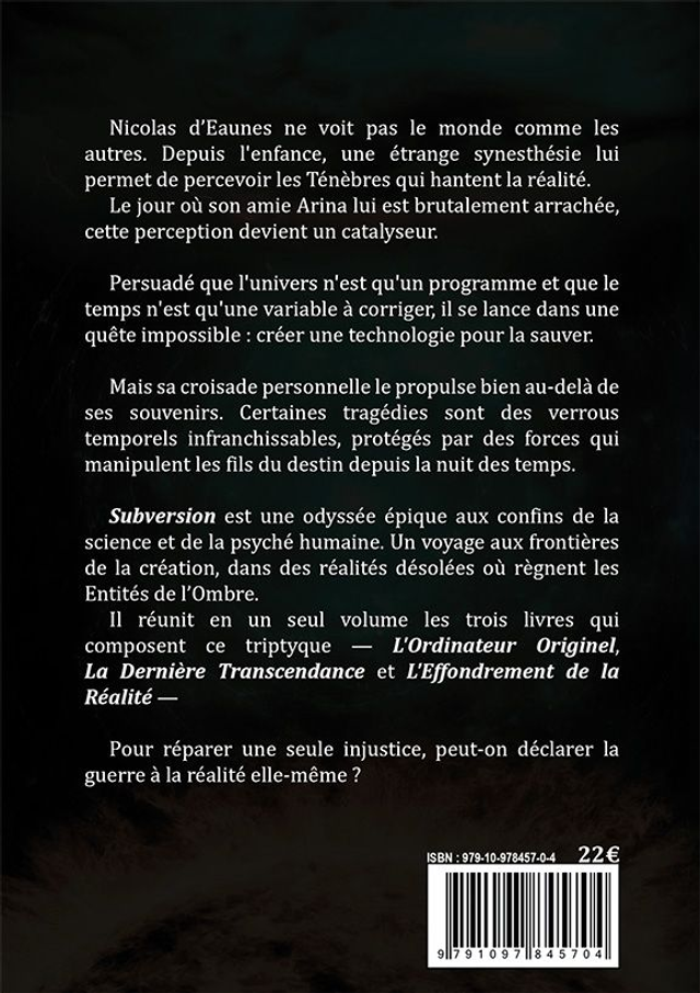 Nicolas d’Eaunes ne voit pas le monde comme les autres. Depuis l'enfance, une étrange synesthésie lui permet de percevoir les Ténèbres qui hantent la réalité. Le jour où son amie Arina lui est brutalement arrachée, cette perception devient un catalyseur. Persuadé que l'univers n'est qu'un programme et que le temps n'est qu'une variable à corriger, il se lance dans une quête impossible : créer une technologie pour la sauver.